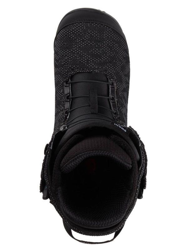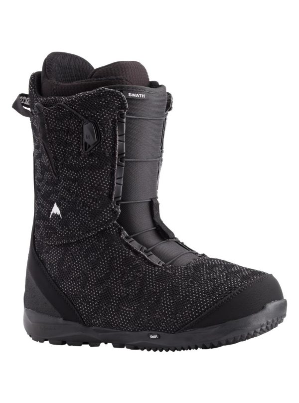 Experience the perfect blend of responsive control and natural flex with the men’s Burton Swath Snowboard Boots. The advanced Ultraweave shell material eliminates bulky seams, creating a lightweight, durable, and seamless shell. An articulated cuff enhances your range of motion for superior freestyle performance with locked-in heel security. Speed Zone lacing delivers precision control with warrantied-for-life New England Rope laces. ReBounce technology places responsive cushioning closer to your foot and performs in all temperatures, while heat-moldable liners and reflective heat tech maximize warmth and comfort for extended riding sessions.